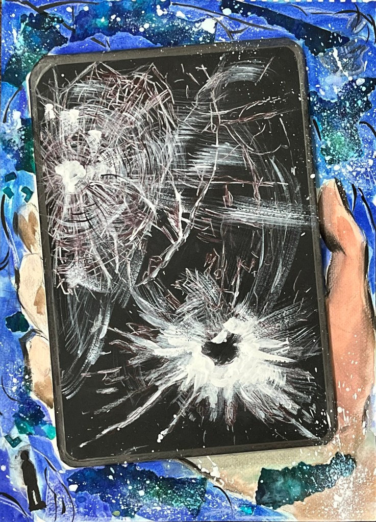 Internet Addiction now exists and new disorders have been constructed from Social media. One huge example can be, FOMO — fear of missing out — where many users are afraid when they are away from their screens because of new events they are missing out on. My illustration of a broken iphone depicts how someone may feel without their phone, referencing the title “Apart of Me is Missing.” In the background of my illustration, we can see paint splatters and pieces of paper. This really enhances the messiness and cracks of the screen. The color blue was used to contrast this idea since blue often symbolizes calmness and stability. Other meanings of the color blue can be sadness and depression, which enhances the feeling the person may feel without their phone. This is why I like to compare iphones to a Double-edge blade. Phones have their many benefits; Most notably, communication.